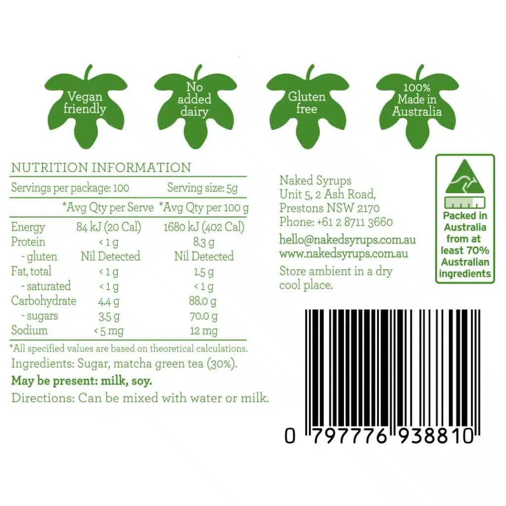 The Naked Syrups Matcha powder uses only the finest Japanese Matcha Tea & natural ingredients to experience the true Matcha experience cup after cup. Can be used in hot or cold application.